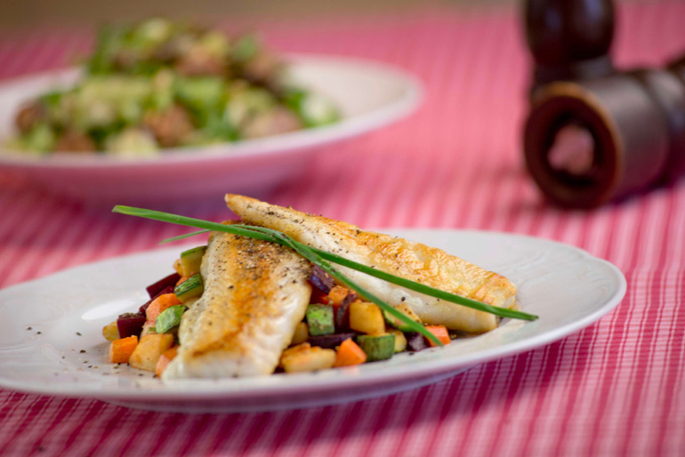 • BRANZINO ALLA PLANCHA: Φρέσκο φιλέτο λαβράκι στη σχάρα, σε ratatouille λαχανικών
