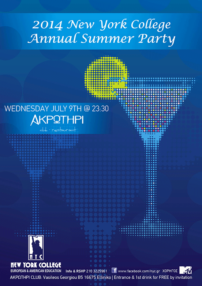 Το New York College, διοργανώνει την Τετάρτη, 9 Ιουλίου και ώρα 23:30 στο Ακρωτήρι Club Restaurant (Βασιλέως Γεωργίου Β5, Άγιος Κοσμάς, Άλιμος, Αλίμου 167 77) το καθιερωμένο Ετήσιο Πάρτι του για να γιορτάσει τα 26 χρόνια επιτυχιών και διακρίσεων στην Ελλάδα και στο εξωτερικό.