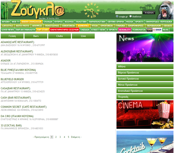 Με ένα κλικ ανά περιοχή, μπορείτε εύκολα να αποφασίσετε για τον προορισμό σας, αφού στην κατηγορία «Έξοδος» θα βρείτε οτιδήποτε έχει σχέση με τη διασκέδασή σας. Μπορείτε να επιλέξετε εστιατόρια, μπαρ, κλαμπ και γαστριμαργικές «οάσεις» σε διάφορες περιοχές του κέντρου της Αθήνας, των Βορείων, Ανατολικών, Δυτικών, Νοτίων Προαστίων και του Πειραιά.