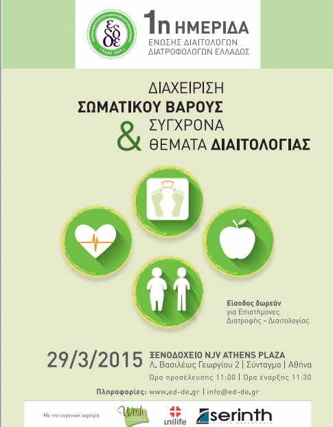 Η ημερίδα έχει θέμα: «Διαχείριση σωματικού βάρους και σύγχρονα θέματα διαιτολογίας» και πραγματοποιείται στο ξενοδοχείο NJV ATHENS PLAZA, Λεωφ. Βασιλέως Γεωργίου 2, στο Σύνταγµα.