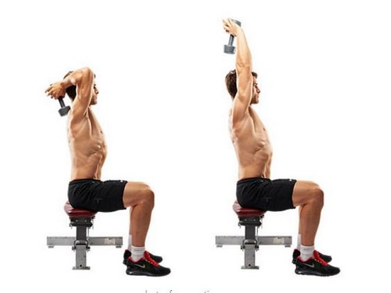 Θα πρέπει να καθίσεις για να κάνεις αυτή την άσκηση. Θα σηκώνεις ένα μόνο βαράκι: πιάσε το έτσι ώστε οι παλάμες σου να κοιτάνε προς τα επάνω και πίεσε τες στο επάνω μέρος από το βαράκι. Κράτησε το βαράκι στο στήθος σου ενώ προσπαθείς να τοποθετήσεις σωστά τα χέρια σου. Διατηρώντας το επάνω μέρος των χεριών σταθερό, λύγισε τους αγκώνες σου και με αργές κινήσεις τοποθέτησε το βαράκι πίσω από το κεφάλι σου μέχρι να είναι λίγο πιο κάτω από την ευθεία. Διατήρησε τους αγκώνες σου κοντά στο κεφάλι. Δε χρειάζεται να αναφέρω ότι αυτή η άσκηση θα κάνει τους τρικέφαλους σου να καίνε.