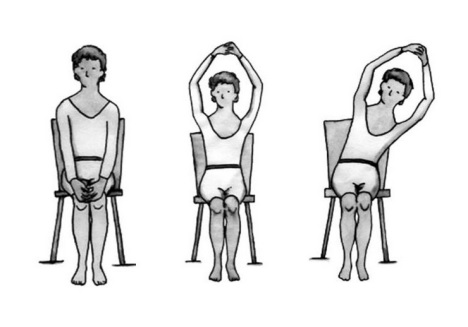 - Σε μια καρέκλα, ο ασθενής ενώνει τα χέρια μπροστά του. Ενωμένα όπως είναι, τα σηκώνει πάνω από το κεφάλι και γέρνει στο πλάι, διατηρώντας τους ώμους σε κάμψη