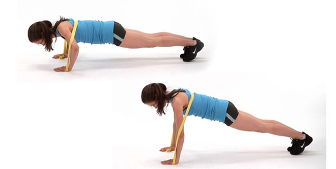Περάστε από τις παλάμες σας και πίσω από τη πλάτη σας τον ιμάντα ή το λάστιχο και εκτελέστε κάμψεις με ένταση. Η αυξημένη δυσκολία λόγω της extra αντίστασης θα σας επιτρέψει να ”ανεβείτε επίπεδο” στις κάμψεις.