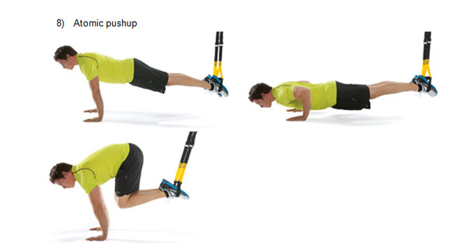 Στην στάση των pushup τοποθετήστε τα πόδια σας στον ιμάντα του TRX ώστε να βρίσκονται στον αέρα. Όταν εκτελέσετε μία κάμψη και βρίσκεστε με τα χέρια τεντωμένα φέρτε τα γόνατά σας μέχρι το στήθος. Τα atomic pushups όχι μόνο προπονούν το στήθος αλλά και το κορμό και επιταχύνουν το μεταβολισμό λόγω της κίνησης όλου του σώματος.