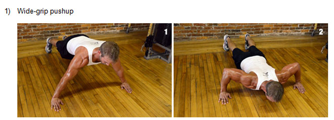 Πάρτε θέση για τα pushups αλλά αυτή τη φορά ανοίξτε τις παλάμες σας πιο έξω από τους ώμους σας, αυτό θα επιβαρύνει το στήθος περισσότερο κατά την άσκηση αποφορτίζοντας ένα ποσοστό της έντασης από τρικέφαλα και τους ώμους.