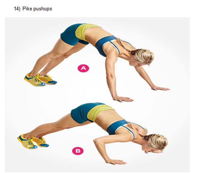 Ξεκινώντας από τη στάση των κάμψεων ανασηκώστε τους γοφούς σας ψηλά φέρνοντας με αυτό το τρόπο τα πόδια σας κοντά στα χέρια και κρατήστε τη πλάτη σας σε ευθεία από πάνω προς τα κάτω σχηματίζοντας ένα τρίγωνο. Σε αυτή τη στάση χρησιμοποιήστε τη δύναμη των ώμων σας και εκτελέστε κάμψεις κατεβαίνοντας όσο μπορείτε.