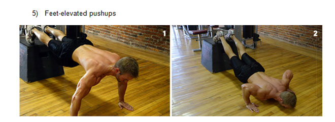 Κάντε κανονικά pushups αλλά με τα πόδια σας τοποθετημένα σε υψηλότερο σημείο. Όσο μεγαλύτερη η κλίση τόσο μεγαλύτερη η ένταση στους ώμους το στήθος και τους μύες στο λαιμό και το σβέρκο.