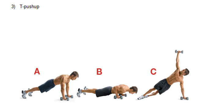 Ξεκινήστε από τη κλασσική θέση των pushup, σηκώστε ένα χέρι και γυρίστε προς τη πλευρά του χεριού το σώμα σας εκτείνοντας το χέρι σας προς τα πάνω σχηματίζοντας ένα Τα, κρατήστε το βλέμμα σας στο χέρι που σηκώνεται. Επαναλάβετε για το άλλο χέρι. Προσθέστε αλτήρες στα χέρια για να αυξήσετε τη δυσκολία. Δε γυμνάζεται μόνο το στήθος σας αλλά και τους ώμους τους θωρακικούς αλλά και τους μυς που βοηθάνε στη περιστροφή.
