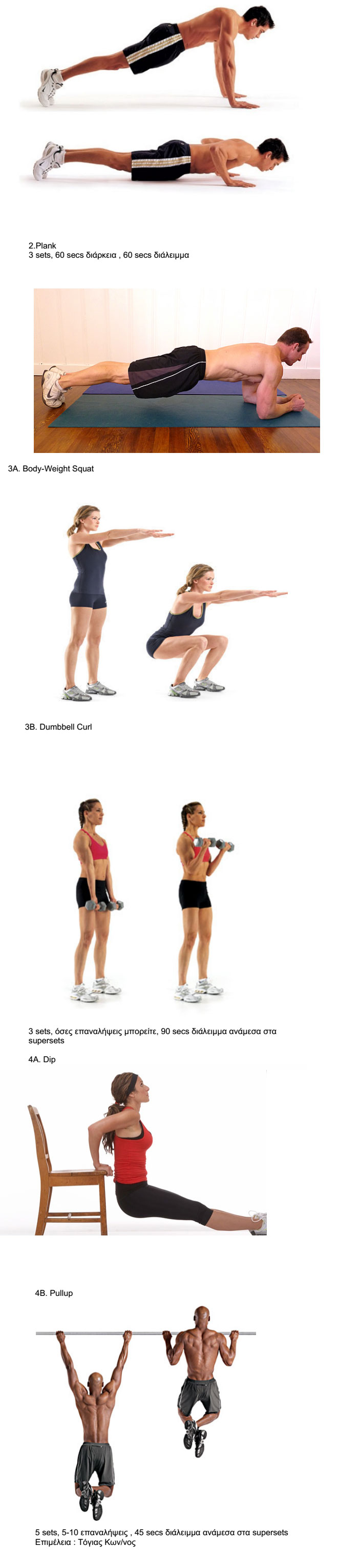 Σας παραθέτουμε εύκολες και γρήγορες ασκήσεις οι οποίες αποτελούν μέρος ενός συνολικού προγράμματος 8 ημερών συνολικά 2 εβδομάδων (4 προπονήσεις/ βδομάδα) που θα σας βοηθήσει στην απώλεια βάρους αλλά και στην ενδυνάμωση όλου του σώματος. Οι ασκήσεις μπορούν να εκτελούνται από το σπίτι σας, το μόνο που θα χρειαστείτε είναι μονόζυγο ένα σετ αλτήρες,
