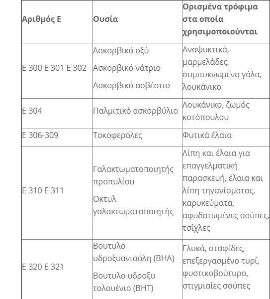 Παραδείγματα ευρέως χρησιμοποιούμενων αντιοξειδωτικών στην ΕΕ: