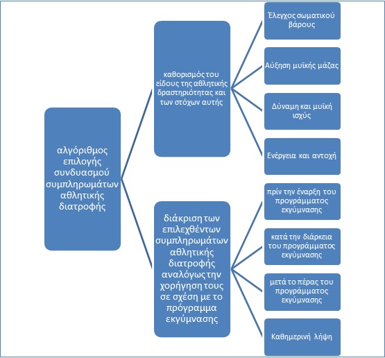 Ένας χρήσιμος αλγόριθμος στην επιλογή του ιδανικού συνδυασμού συμπληρωμάτων αθλητικής διατροφής στηρίζεται αρχικά στον καθορισμό του στόχου του προγράμματος εκγύμνασης και εν συνεχεία στην διάκριση των επιλεχθέντων συμπληρωμάτων με βάση την χρονική στιγμή λήψης τους σε σχέση με το πρόγραμμα εκγύμνασης (Εικόνα 1):