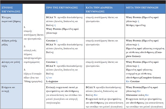 Στον παρακάτω πίνακα αναγράφονται επιγραμματικά τα σημαντικότερα συμπληρώματα διατροφής σε σχέση με τον στόχο της εκγύμνασης και την λήψη τους πριν, κατά την διάρκεια και μετά την εκγύμναση.
