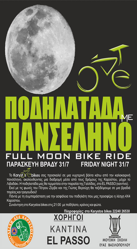 Το Karystos Bikes διοργανώνει για 4η συνεχόμενη χρονιά, και σας προσκαλεί το βράδυ της Παρασκευής 31/7, σε μια νυχτερινή βόλτα κάτω από την καλοκαιρινή πανσέληνο, ακολουθώντας μια διαδρομή μέσα από τους δρόμους της Καρύστου, μέχρι την παραλία Λιβαδάκι. Η ποδηλατάδα μας θα τερματίσει στην παραλία της Γαλλίδας, στο EL PASSO (καντίνα).