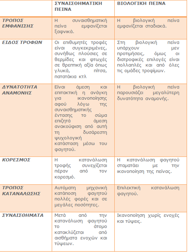 Η συναισθηματική πείνα και η βιολογική πείνα διαφέρουν σε αρκετά σημεία. Ο πίνακας που ακολουθεί βοηθάει στο διαχωρισμό τους.
