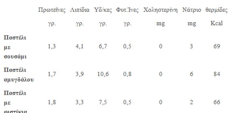 Διατροφική σύνθεση παστελιού ανά μερίδα (15 γραμμαρίων)
