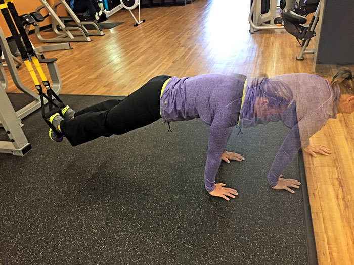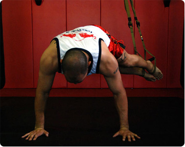 Τοποθετώ τα πόδια μου στους υποδοχείς ποδιών του ιμάντα και με το σώμα μου προς το έδαφος. Σηκώνω τον κορμό μου μέχρι οι ώμοι και τα ισχία μου βρεθούν στην ίδια ευθεία.Τα χέρια μου παραμένουν κλειδωμένα στο πάτωμα και στην συνέχεια μετακινώ το σώμα μου όσο μπορώ μακρυά από τον ιμάντα και επανέρχομαι στην αρχική μου θέση.Όταν σπρώχνουμε το σώμα μας οι κοιλιακοί μας παίρνουν φωτιά ενώ ταυτόχρονα δουλεύουν και τα χέρια μας.
