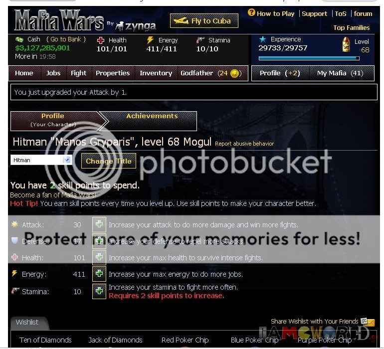 Όποτε ανεβαίνετε level σας δίνονται πέντε πόντοι για να τους κατανείμετε στα πέντε attributes του χαρακτήρα σας. Συνήθως, οι περισσότεροι χρήστες προτιμούν το energy και καλά κάνουν διότι αυτό τους επιτρέπει να ολοκληρώσουν περισσότερες δουλειές, άρα να περιμένουν λιγότερη ώρα ώσπου να αναπληρωθεί το energy τους. Άλλωστε, το Attack και το Defence, ενισχύονται με αντικείμενα τα οποία αγοράζετε ή κερδίζετε στη μάχη ως λάφυρα. Το Stamina είναι επίσης μια καλή επένδυση των πόντων σας (αν και χρειάζεται δύο πόντους για να ανέβει έναν βαθμό) αλλά μόνο αν έχετε πολλά μέλη στη συμμορία σας (άρα και πολλούς φίλους στο Facebook) για να μπορέσετε να πολεμήσετε με προοπτικές τους άλλους χρήστες. Όσο για το Energy, η κατανομή πόντων εδώ είναι περιττή, καθώς σε κάθε μάχη συνήθως χάνετε το πολύ 20 πόντους απ’ το Health σας, άρα οι 100 αρχικοί σας πόντοι είναι αρκετοί και με το παραπάνω.