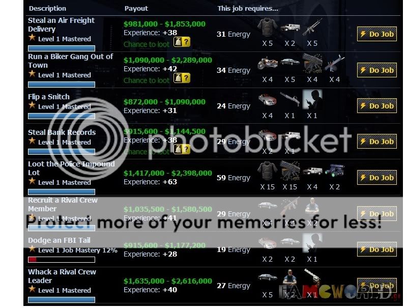 Για να αναπτύξετε τον χαρακτήρα σας θα πρέπει να κερδίσετε experience κι αυτό γίνεται κατά κύριο λόγο ολοκληρώνοντας δουλειές που σας ανατίθενται. Τις βρωμοδουλειές αυτές τις επιλέγετε εσείς οι ίδιοι μέσα από μία λίστα που αφορά την κατηγορία του level στην οποία βρίσκεστε. Δεν χάνετε ποτέ health, αλλά αντιθέτως σας αφαιρείται energy το οποίο αναπληρώνεται με αργό ρυθμό (ένας πόντος κάθε λίγα λεπτά). Όταν καταφέρετε να κερδίσετε το απαιτούμενο experience τότε ανεβαίνετε level, άρα από ένα επίπεδο και μετά ξεκλειδώνετε τις πιο δύσκολες δουλειές οι οποίες δίνουν περισσότερα χρήματα και περισσότερο experience.
