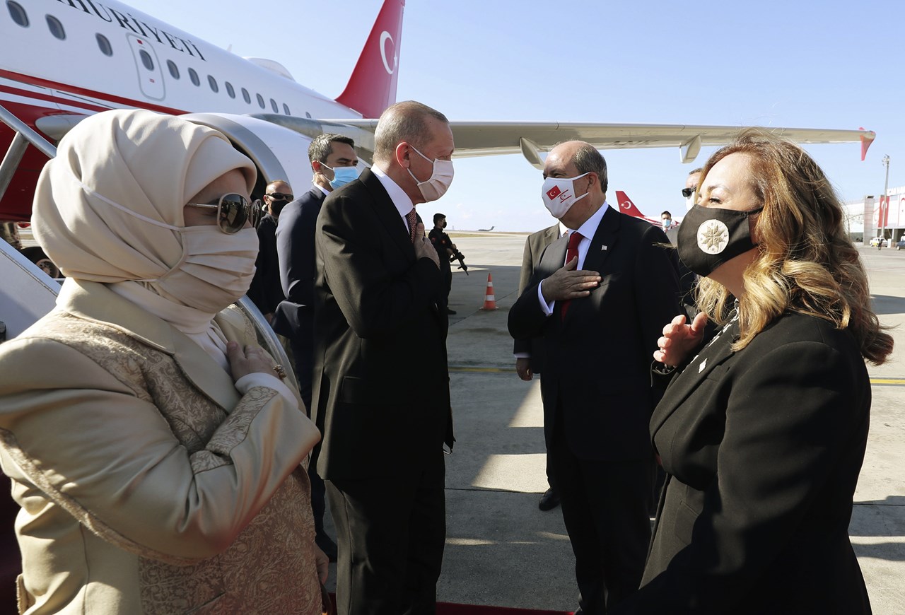 Ο Ρετζέπ Ταγίπ Ερντογάν έφτασε με το προεδρικό αεροσκάφος «Κωνσταντινούπολη» στις 12.30 (ώρα Κύπρου) κι έγινε δεκτός με μία πανηγυρική τελετή από τον Ερσίν Τατάρ.