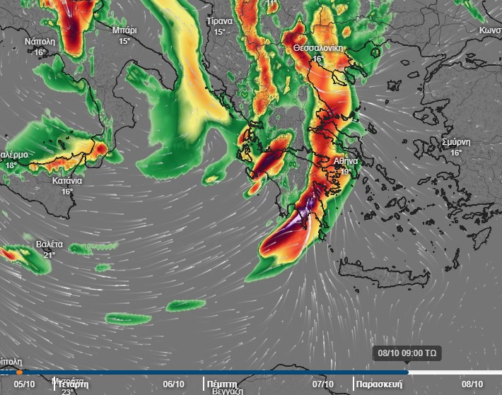 Στον προγνωστικό χάρτη που ακολουθεί παρουσιάζονται τα εκτιμώμενα αθροιστικά ύψη υετού (βροχές/ καταιγίδες) έως τις βραδινές ώρες της Παρασκευής 8 Οκτωβρίου.