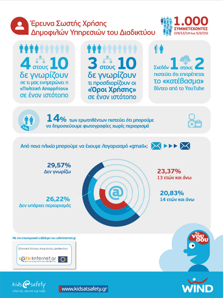 Η online έρευνα υποστηρίχθηκε από την εκστρατεία ενημέρωσης kids@safety της WIND, μια πρωτοβουλία της εταιρείας για την ασφαλή χρήση του Internet και του κινητού από παιδιά και εφήβους.