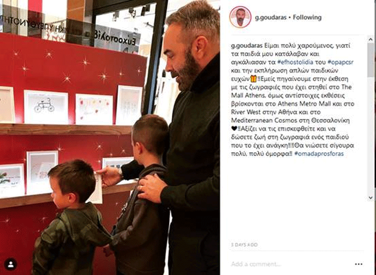 Τα παιδιά έχουν αποτυπώσει τις ευχές τους σε ζωγραφιές, οι οποίες εκτίθενται έως τις 31 Δεκεμβρίου 2018 σε τέσσερις χριστουγεννιάτικες εκθέσεις του ΟΠΑΠ στα εμπορικά πολυκαταστήματα The Mall Athens, Athens Metro Mall και River West στην Αθήνα και στο Mediterranean Cosmos, στη Θεσσαλονίκη. Οι ζωγραφιές είναι, επίσης, διαθέσιμες στην ιστοσελίδα www.omadaprosforas.gr και στην εφαρμογή «Ομάδα Προσφοράς».