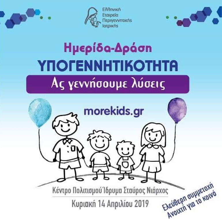 Αναγνωρίζοντας την κρισιμότητα της σημερινής δημογραφικής κατάστασης, η Ελληνική Εταιρεία Προγεννητικής Ιατρικής διοργανώνει την Κυριακή 14 Απριλίου 2019, ανοικτή ενημερωτική Ημερίδα για την υπογεννητικότητα, με στόχο την ανάδειξη των επιπτώσεων του προβλήματος στην οικογένεια και στην κοινωνία, καθώς και τη δημιουργία διαλόγου για την ανεύρεση των καλύτερων δυνατών λύσεων.