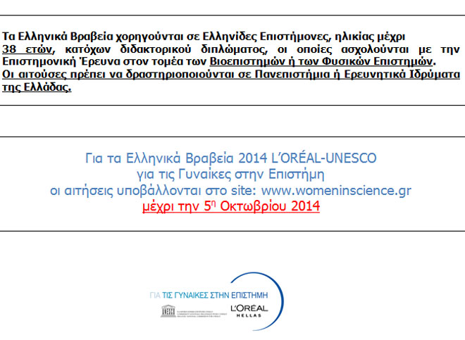 Τα Ελληνικά Βραβεία L’ORÉAL-UNESCO αποτελούν άξονα του διεθνούς προγράμματος “L’ORÉAL-UNESCO για τις Γυναίκες στην Επιστήμη” το οποίο τιμά και υπογραμμίζει κάθε χρόνο τη συνεισφορά διακεκριμένων Γυναικών Επιστημόνων από όλο τον κόσμο. Στα 16 χρόνια της ιστορίας του, η L’Oréal και η UNESCO συνεργάζονται, για να προάγουν την πρόοδο των γυναικών Ερευνητριών. Τα Βραβεία απονέμονται κάθε έτος εκ περιτροπής στους κλάδους των Βιοεπιστημών και των Φυσικών Επιστημών.