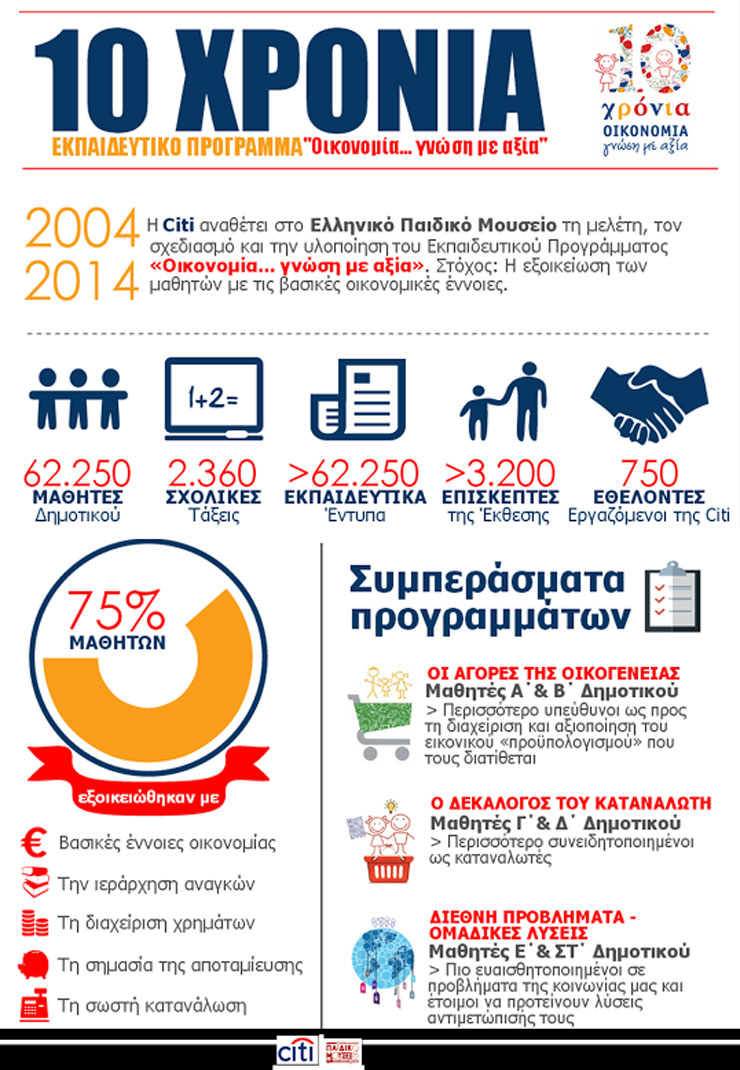 Με τα πιο αισιόδοξα μηνύματα των παιδιών για την αντιμετώπιση της κρίσης, μέσα από τη συνεργασία, την ομαδικότητα και την αλληλεγγύη για το κοινό καλό, συμπληρώθηκαν φέτος 10 χρόνια από την έναρξη του Προγράμματος Οικονομικής Εκπαίδευσης «Οικονομία: γνώση με αξία!» της Citi που υλοποιήθηκε σε δημοτικά σχολεία, σε συνεργασία με το Ελληνικό Παιδικό Μουσείο.
