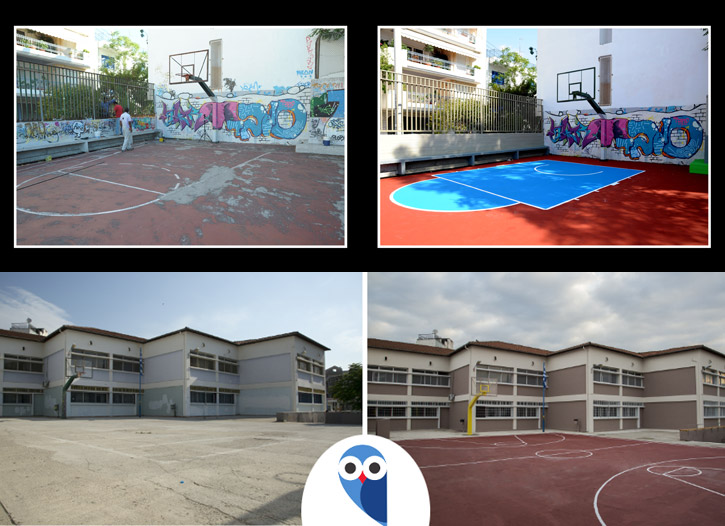Στο 1ο-14ο Ολοήμερο Δημοτικό Σχολείο Ευόσμου εξωραΐσαμε και ανακαινίσαμε πλήρως τον ανάγλυφο χάρτη της Ελλάδας και ασφαλτοστρώσαμε το γήπεδο μπάσκετ.