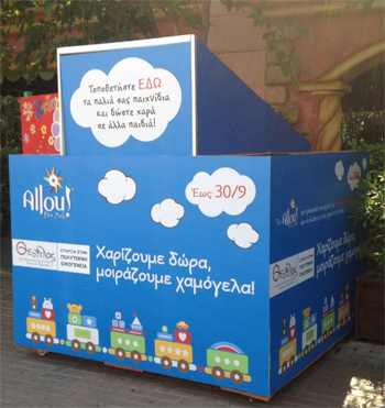 Το Allou! Fun Park καλεί όλους τους φίλους και επισκέπτες του να φέρουν ως τις 30/9 παιχνίδια και σχολικά είδη που είναι σε καλή κατάσταση και θέλουν να δωρίσουν και να τα τοποθετήσουν στα δύο μεγάλα κουτιά που βρίσκονται σε κεντρικά σημεία του Allou! και του Kidom.