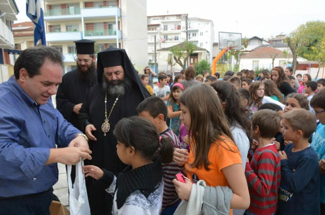Συγκεκριμένα ο Σεβασμιώτατος Μητροπολίτης Λαγκαδά κ.κ. Ιωάννης και ο Γεν. Διευθυντής της «Αποστολής» κ. Δήμτσας, επεσκέφθησαν κατά σειρά το 1ο, το 3ο, και το 2ο Δημοτικό Σχολείο Λαγκαδά, όπου τα παιδιά τους υποδέχτηκαν με ιδιαίτερη χαρά γεμίζοντας με τις αυθόρμητες εκφράσεις και εκδηλώσεις τα προαύλια των σχολείων τους.