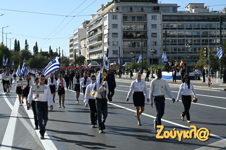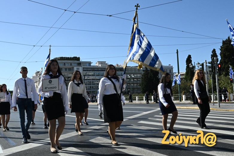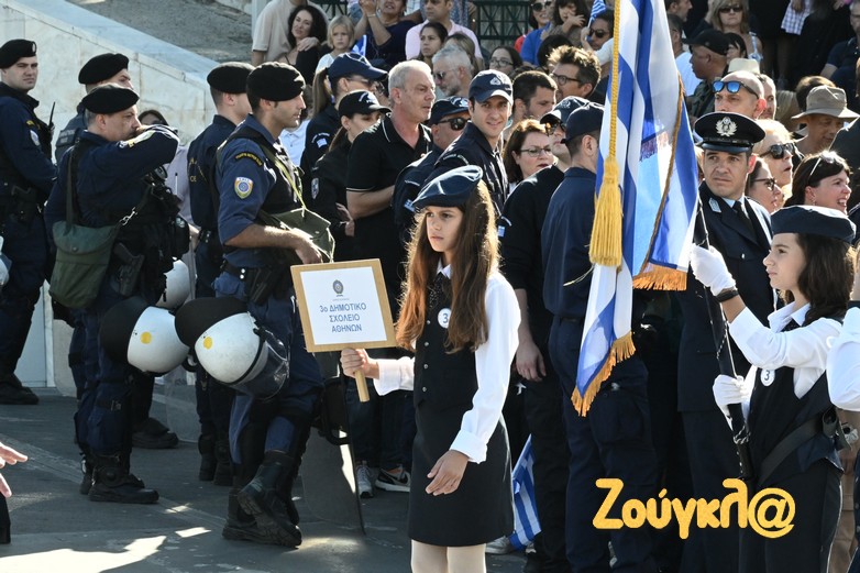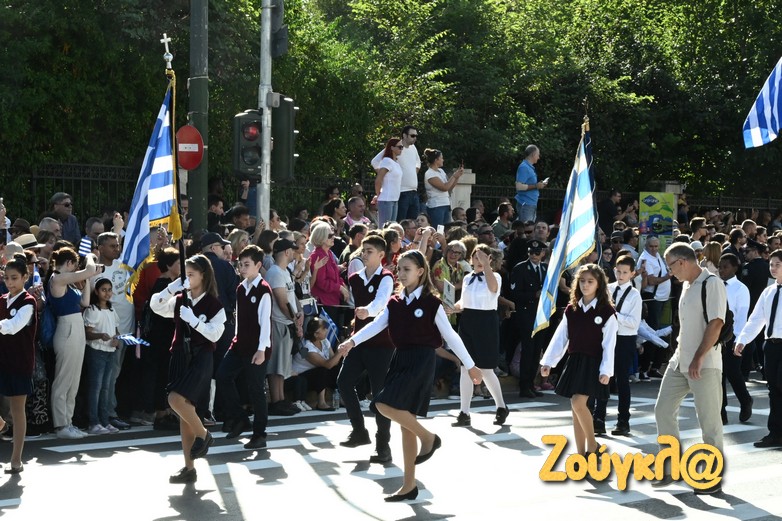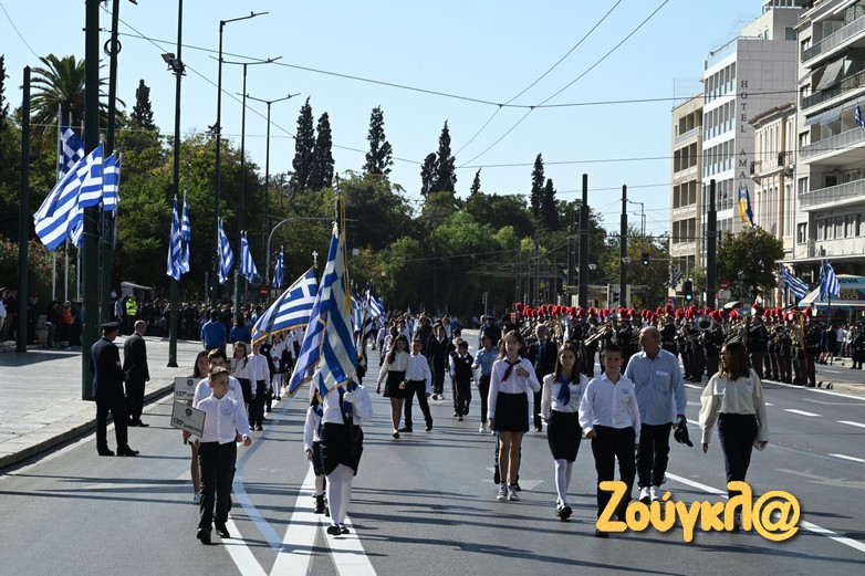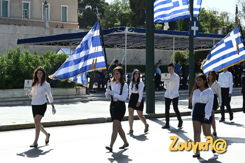 Εκατοντάδες μαθητές από διάφορα σχολεία της Αθήνας παρέλασαν μπροστά από το μνημείο του Άγνωστου Στρατιώτη, στην Λεωφόρο Αμαλίας. Η ηλιόλουστη ημέρα είχε ως αποτέλεσμα να βρεθούν στο κέντρο της Αθήνας χιλιάδες πολίτες που παρακολούθησαν της παρέλαση των μαθητών.