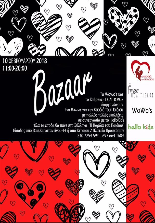 Ενόψει λοιπόν της Παγκόσμιας Ημέρας Συγγενών Καρδιοπαθειών και προκειμένου να βοηθηθεί «Η καρδιά του Παιδιού» οργανώνεται το Σάββατο 10 Φεβρουαρίου από τις 11 π.μ ως τις 8 μμ, το δεύτερο WOWO’s BAZAAR στην αίθουσα «Επήρεια – Πολιτισμός», Βασιλέως Κωνσταντίνου 44, Αθήνα.