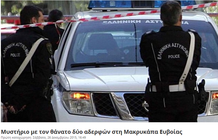 Πέπλο μυστηρίου καλύπτει μία περίεργη υπόθεση θανάτου δύο ανθρώπων στη Μακρυκάπα Ευβοίας, οι οποίοι εντοπίστηκαν νεκροί σήμερα, Σάββατο, περίπου στις 15.00, έξω από το σπίτι τους.