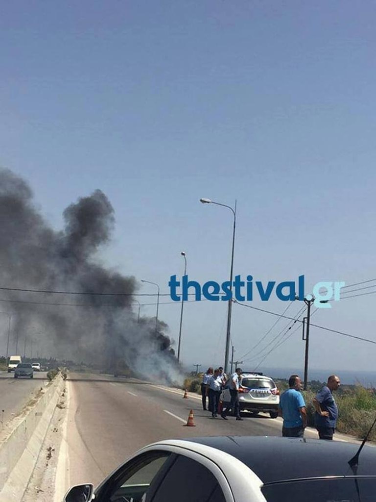Σύμφωνα με τις πρώτες πληροφορίες ένα αυτοκίνητο εξετράπη της πορείας του και έπεσε πάνω σε κολώνα. Λόγω των υψηλών θερμοκρασιών το αυτοκίνητο πήρε φωτιά.
