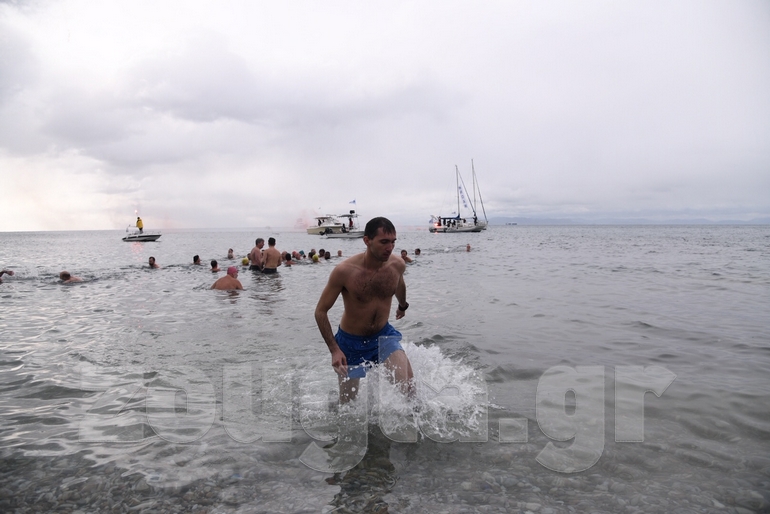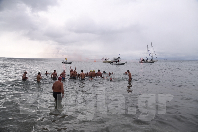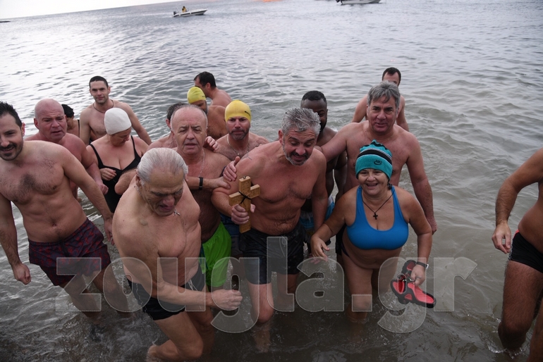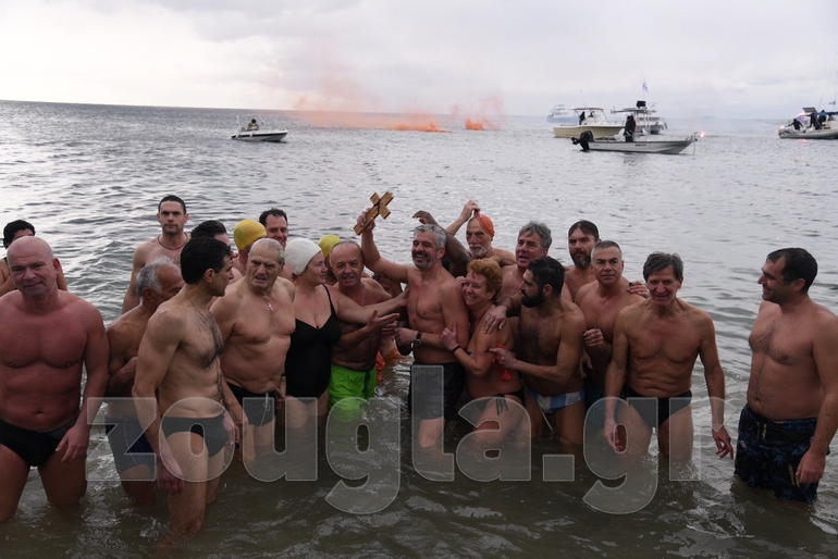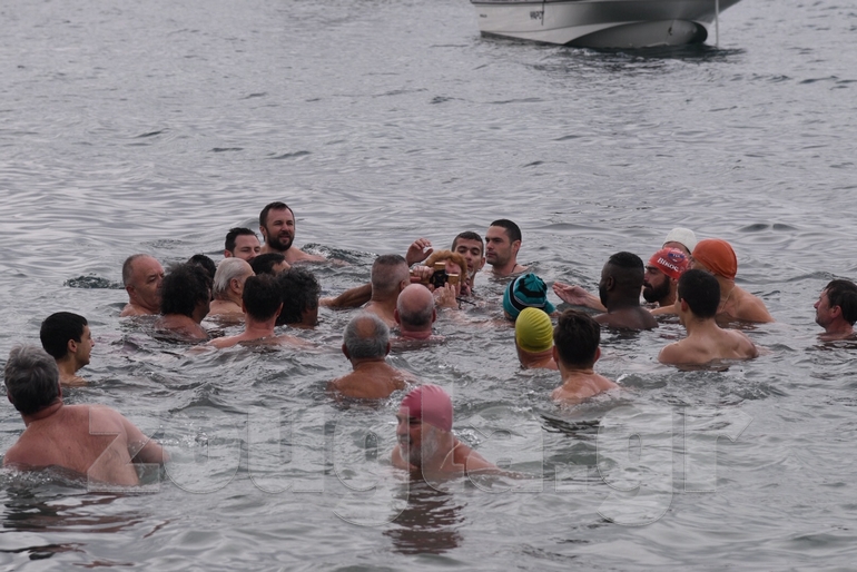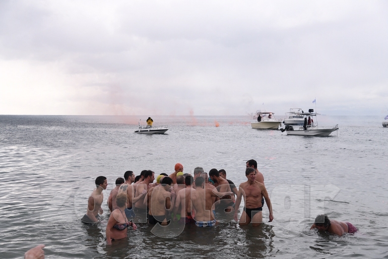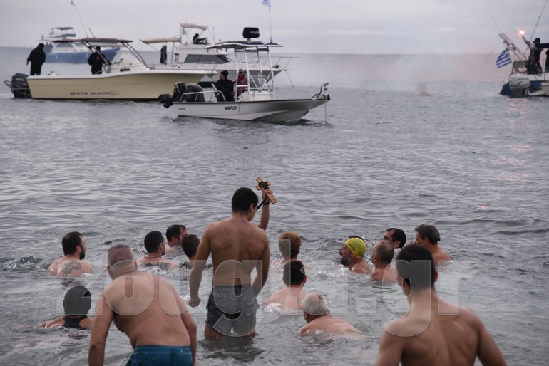 Παρά τη βροχή και το τσουχτερό κρύο πλήθος κόσμου -κυρίως χειμερινοί κολυμβητές- βρέθηκε στην παραλία του Παλαιού Φαλήρου για να παρακολουθήσει από κοντά τον Aγιασμό των υδάτων και την κατάδυση του Τιμίου Σταυρού στα νερά.