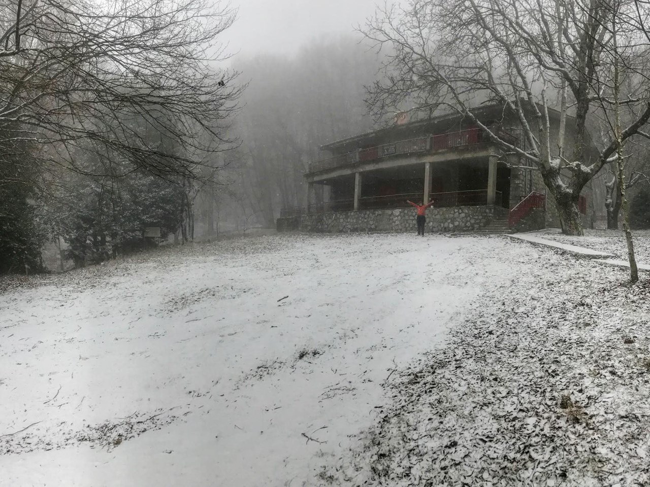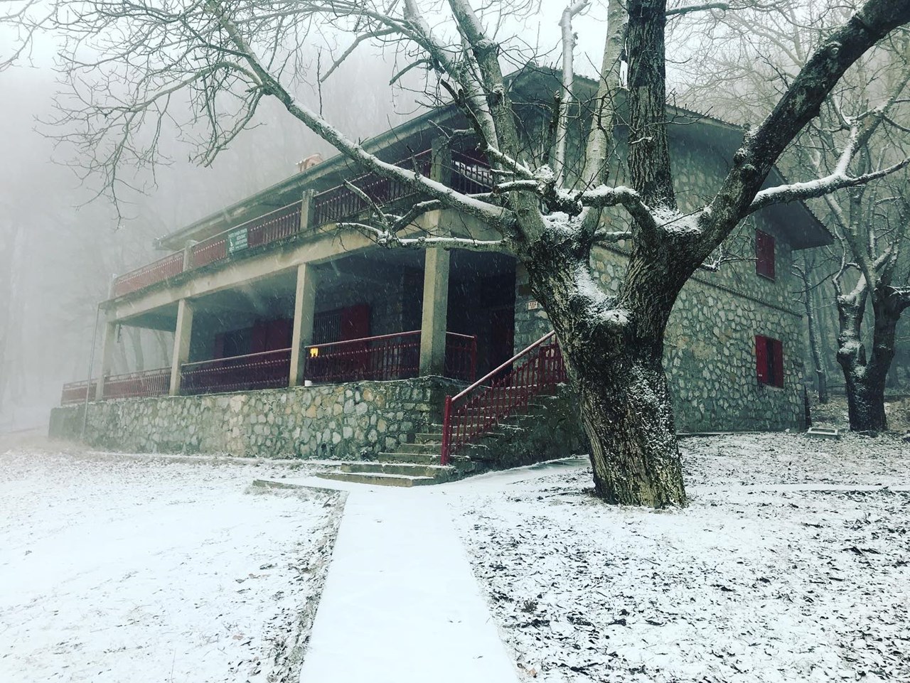Οι πρώτες νιφάδες χιονιού έκαναν την εμφάνισή τους στο καταφύγιο του Συλλόγου Ελλήνων Ορειβατών που βρίσκεται σε υψόμετρο 1.000 μέτρων και λειτουργεί κανονικά για όσους θέλουν να χαρούν το λευκό τοπίο.