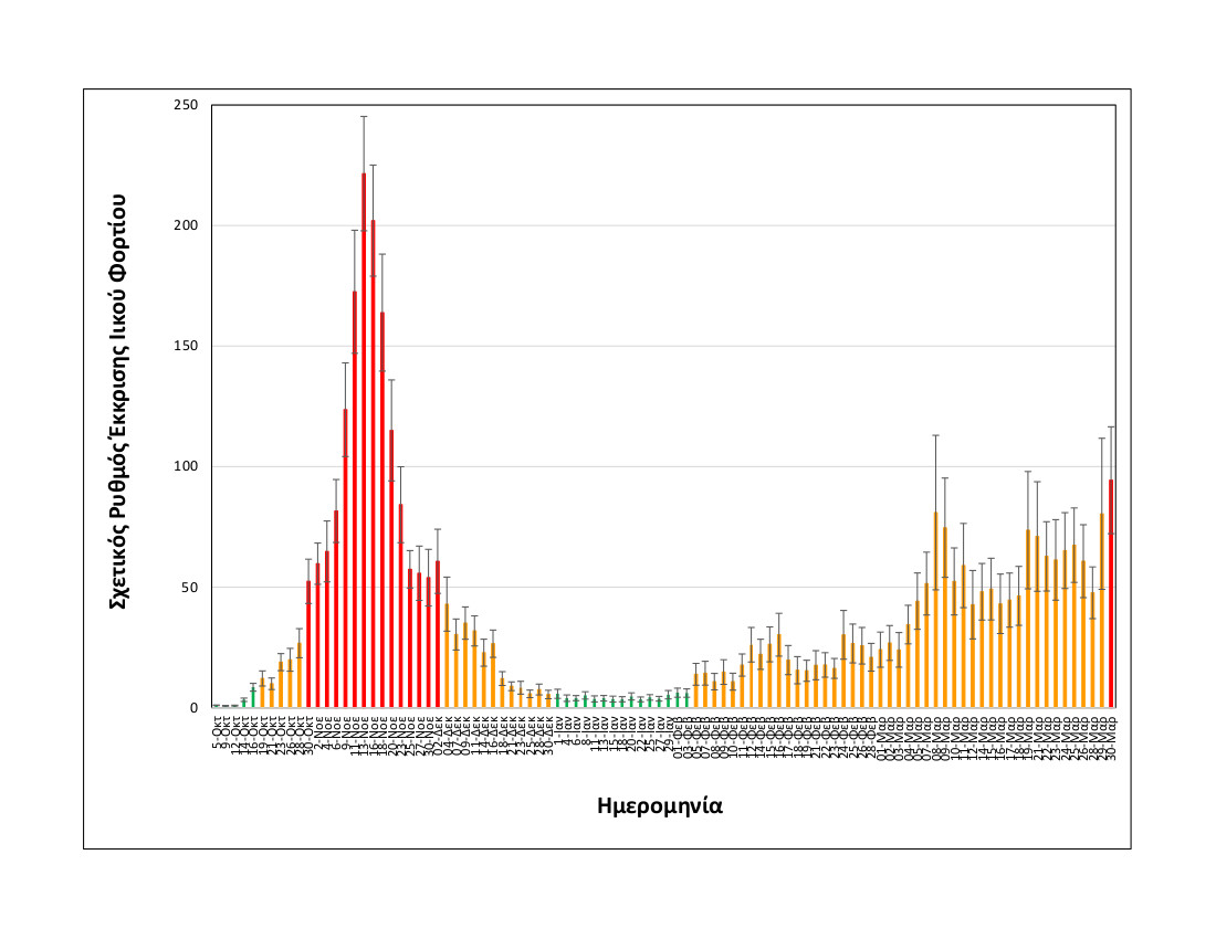 Στα συνημμένα διαγράμματα του ΑΠΘ, που δημοσιεύει το ΑΠΕ-ΜΠΕ, οι ημέρες των δειγματοληψιών που καταγράφονται με κόκκινο χρώμα αντιστοιχούν σε περισσότερα από 500 κρούσματα -όπως ανακοινώθηκαν τις αντίστοιχες ημέρες από τον ΕΟΔΥ-, οι μέρες που καταγράφονται με πορτοκαλί σε 100-400 κρούσματα και οι μέρες που καταγράφονται με πράσινο σε λιγότερα από εκατό κρούσματα.