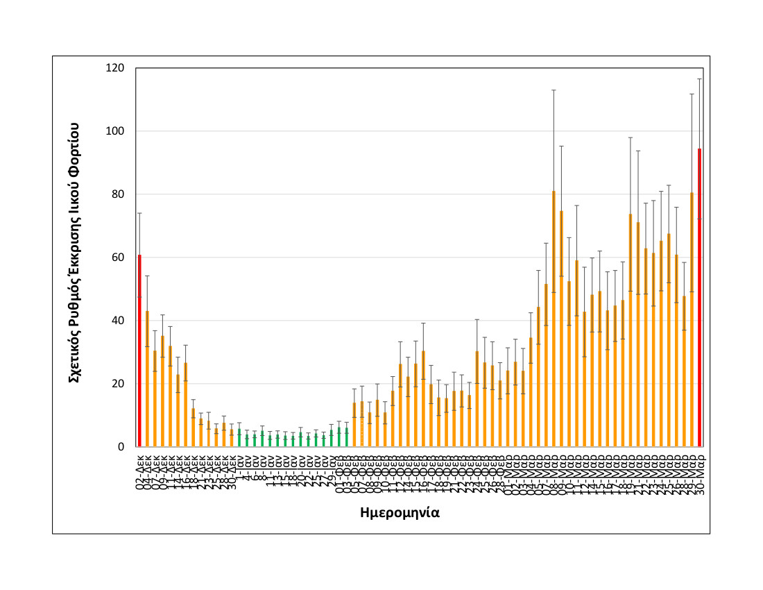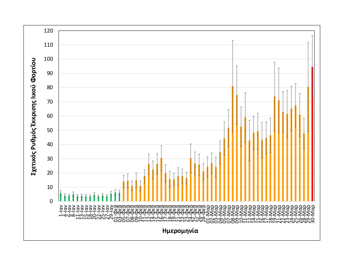 -Αυξημένη κατά 61% σε σχέση με τη μέση τιμή των δύο αμέσως προηγούμενων μετρήσεων, της Παρασκευής 26/3 και της Κυριακής 28/3.