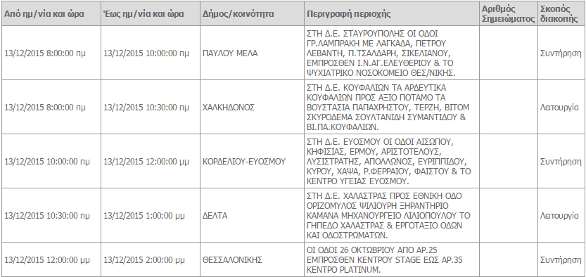 Χωρίς ρεύμα θα μείνουν την Κυριακή περιοχές σε πέντε δήμους της Θεσσαλονίκης.