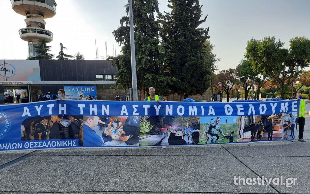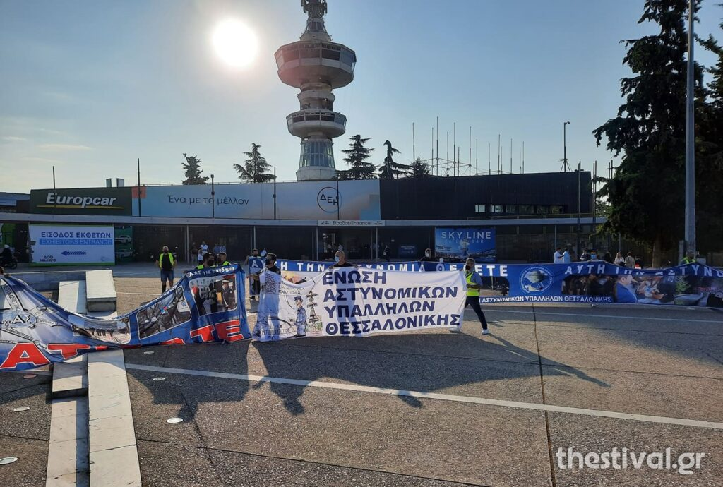 Συμβολική διαμαρτυρία έξω από την κεντρική είσοδο του Διεθνούς Εκθεσιακού Κέντρου της Θεσσαλονίκης, πραγματοποίησαν, το πρωί, μέλη της Ένωσης Αστυνομικών Υπαλλήλων Θεσσαλονίκης, με αφορμή τα σημερινά εγκαίνια της 85ης ΔΕΘ.