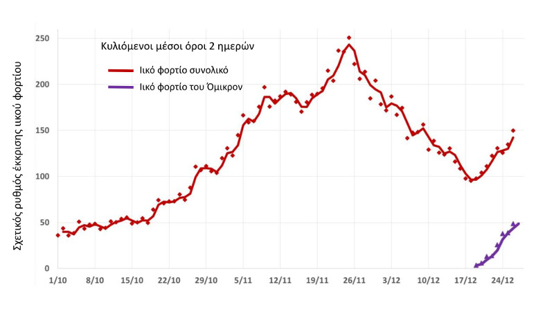 Στη συνέχεια, και μέχρι τις 18/12, καταγράφηκε συνεχόμενη πτωτική τάση του ιικού φορτίου. Από την ημερομηνία εντοπισμού του Όμικρον στα λύματα της πόλης στις 19/12 και μέχρι τις 26/12, παρατηρήθηκε αύξηση του συνολικού ιικού φορτίου κατά 57%. Η αύξηση αυτή όμως περιλαμβάνει αθροιστικά και τα δύο στελέχη, σε μια περίοδο που η διασπορά του Δέλτα παραμένει μεγάλη».