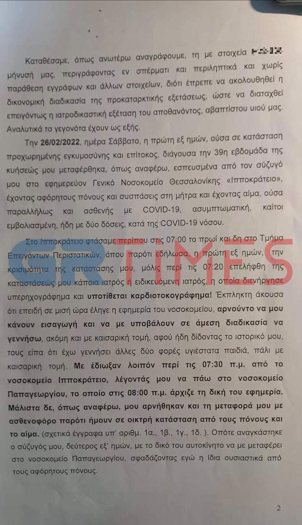 «Στο νοσοκομείο Παπαγεωργίου με εισήγαγαν αρχικώς περί τις 8.40, αντί σε γυναικολογική κλινική για να γεννήσω, σε Covid -19 κλινική στο Τμήμα Επειγόντων Περιστατικών (ΤΕΠ) και μια ώρα μετά, ήτοι στις 9.40, της ίδιας ημέρας, με εισήγαγαν στη μαιευτική κλινική για επείγουσα, άμεση χειρουργική επέμβαση καισαρικής τομής, όπου και τελικώς μια ώρα μετά, ήτοι στις 10.30 γέννησα με καισαρική τομή ένα άσφυγμο, άρρεν, ώριμο νεογνό υπό ισχιακή προβολή, έχοντας ήδη υποστεί εκ της εγκληματικής αρνήσεως, αλλά και της καθυστερήσεως των δύο νοσοκομείων, αποκόλληση πλακούντα και ρήξη μήτρας», συμπληρώνει η μητέρα.