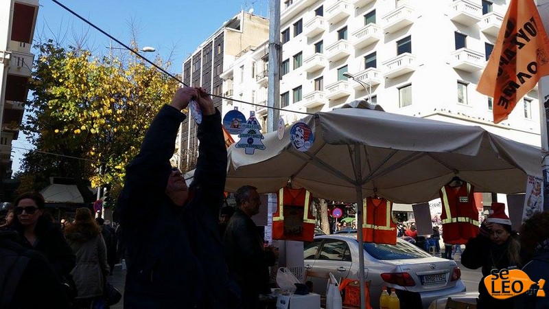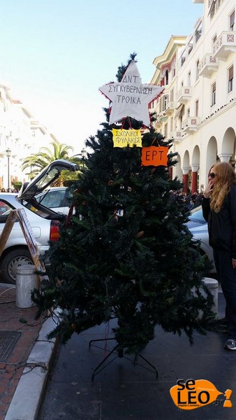 Ένα διαφορετικό δέντρο στόλισαν σήμερα στην πλατεία Αριστοτέλους οι απολυμένοι σχολικοί φύλακες. Όπως σημείωσαν: «Για τα στολίδια φρόντισαν συγκυβέρνηση...
