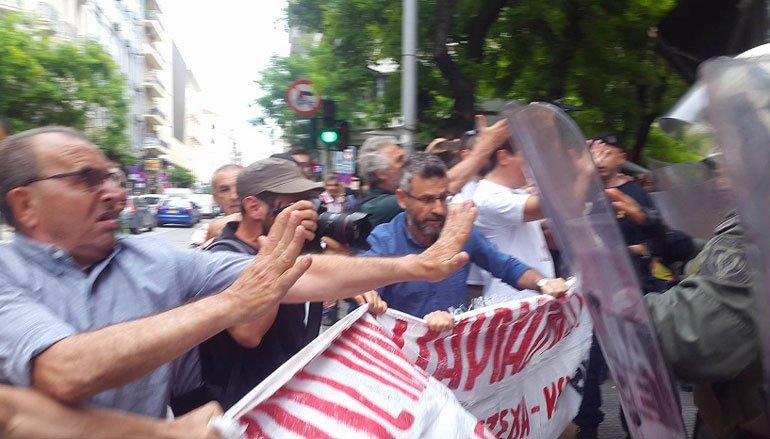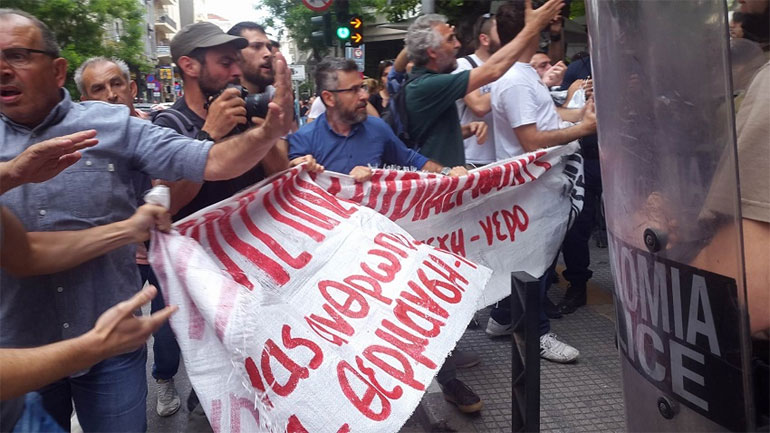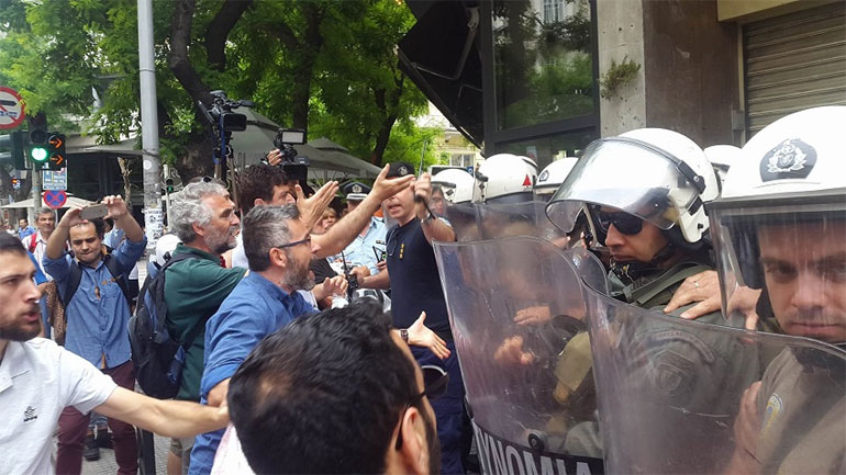 Οι τόνοι ανέβηκαν όταν διαδηλωτές ζήτησαν να περάσει η οφειλέτρια και εκπρόσωπος του Συντονισμού, ώστε να εισέλθουν στο συμβολαιογραφείο. Οι δυνάμεις των ΜΑΤ, που περιφρουρούν το σημείο, αρνήθηκαν, προκαλώντας την έντονη αντίδραση των διαδηλωτών.