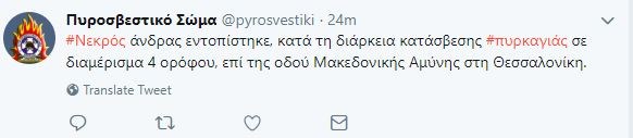 Ένας νεκρός άνδρας εντοπίστηκε τα ξημερώματα της Τετάρτης κατά τη διάρκεια κατάσβεσης φωτιάς σε διαμέρισμα στη Θεσσαλονίκη.