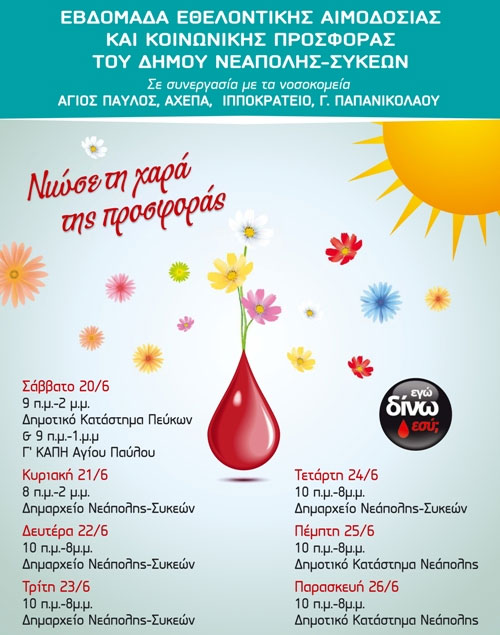 Ο Δήμος Νεάπολης-Συκεών διοργανώνει από σήμερα έως και τις 26 Ιουνίου την τακτική θερινή «Εβδομάδα Εθελοντικής Αιμοδοσίας και Κοινωνικής Προσφοράς».