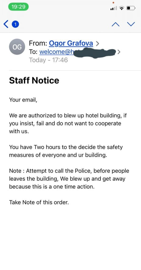 Το e-mail που εστάλη από άγνωστο αποστολέα σε περισσότερα από δέκα ξενοδοχεία προειδοποιώντας για τοποθέτηση βόμβας, προκάλεσε μπαράζ προληπτικών εκκενώσεων και εξονυχιστικούς ελέγχους τόσο στους εσωτερικούς όσο και στους εξωτερικούς χώρους αλλά και περιμετρικά των ξενοδοχειακών εγκαταστάσεων που βρέθηκαν στη λίστα των παραληπτών του επίμαχου μηνύματος.