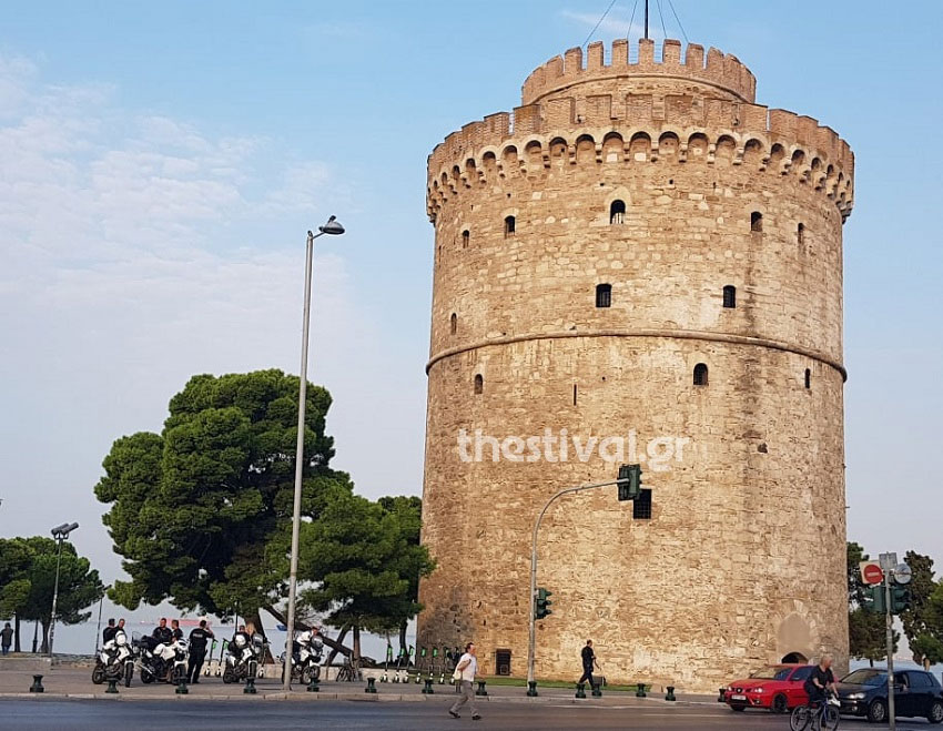 Οι αστυνομικοί παραμένουν μπροστά στον Λευκό Πύργο, προκειμένου να αποτραπεί πιθανή είσοδος ατόμων στο μνημείο για ανάρτηση πανό ή διαμαρτυρία.